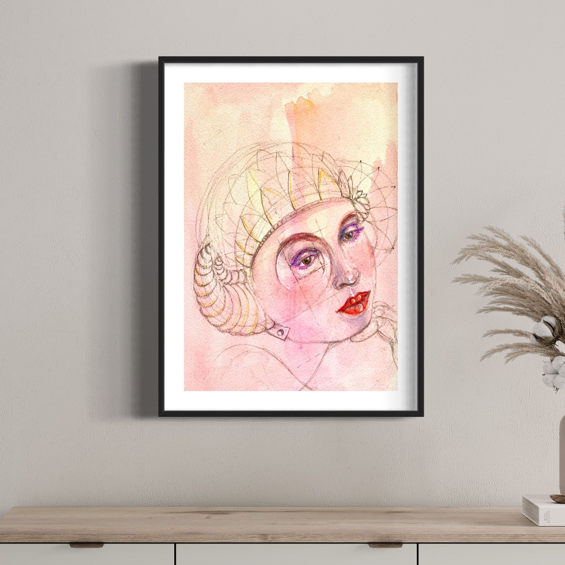 Description: Inspired by The Fibonacci Sequence being a law of maths, science and nature, this piece is one of a series with a fantastical, imaginary character: namely the daughter of Fibonacci. The spiral in maths keeps its shape at all scales and spirals out forever. In visual art, the golden ratio is used to balance a composition and I, for one, often use it without realising. Similarly, in nature, the golden ratio can be observed in how things grow. A nautilus shell or an unfurling fern are perfect examples. I have kept the colours soft to give a beauty and simplicity to the piece.