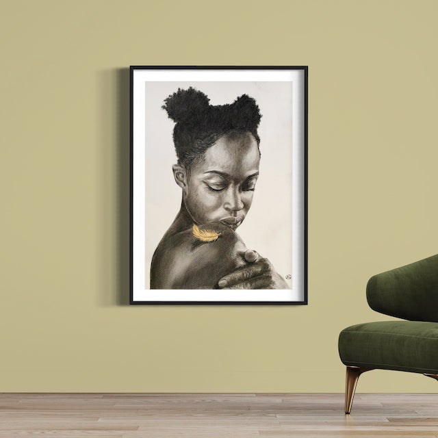 Description: This charcoal pencil portrait is about grief and love. I wanted to capture the moment when a feather lands, a bird sings and it returns you to your 'golden' loved ones.
