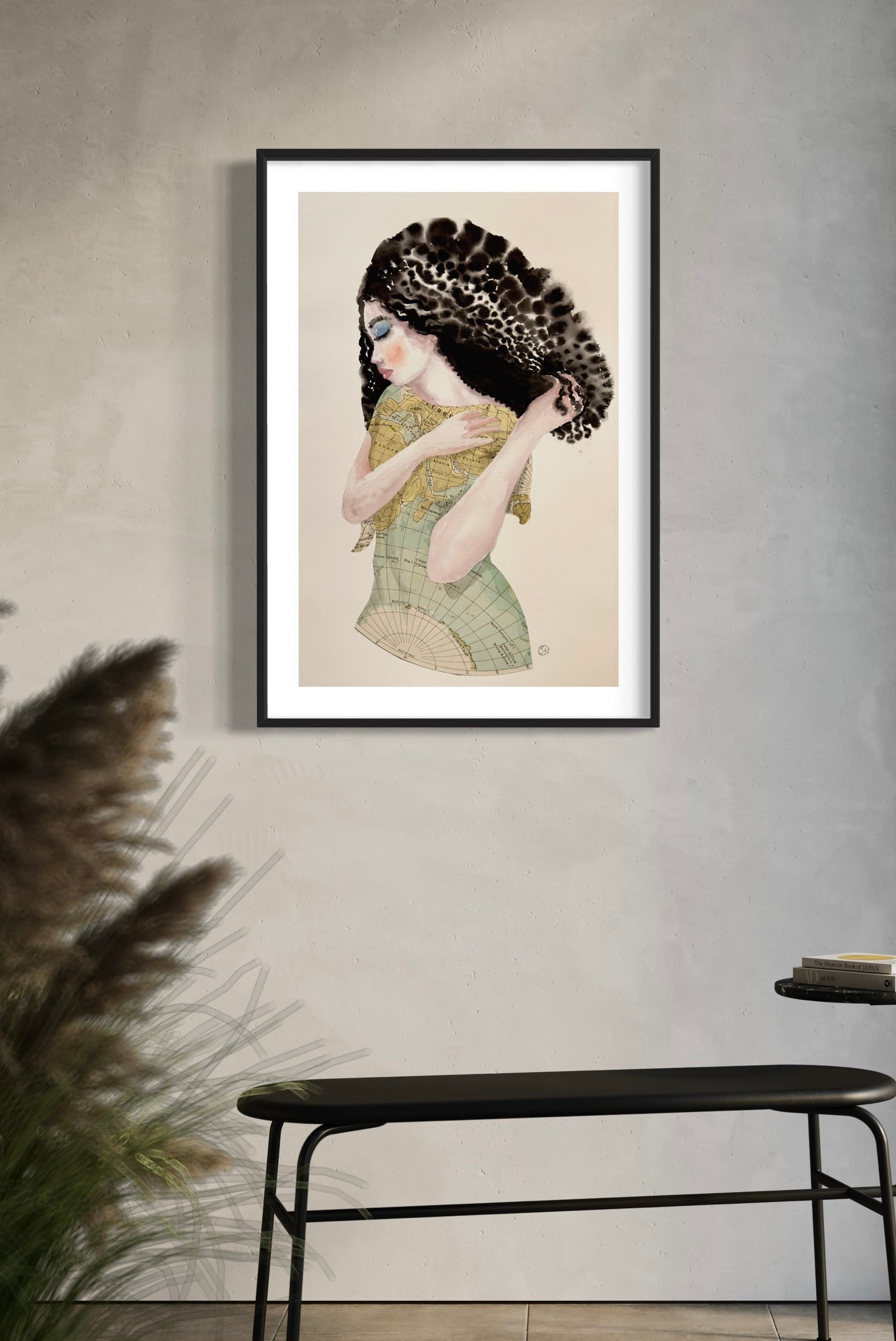 A watercolour representing a 'Gaia-like' Goddess depicted in a globe dress, donned with collaged maps of the earth. Quite simply, Gaia is life. She is the very soul of the earth. She represents the interconnectedness of everything. Earth as a living, self-regulating entity which sustains all life.