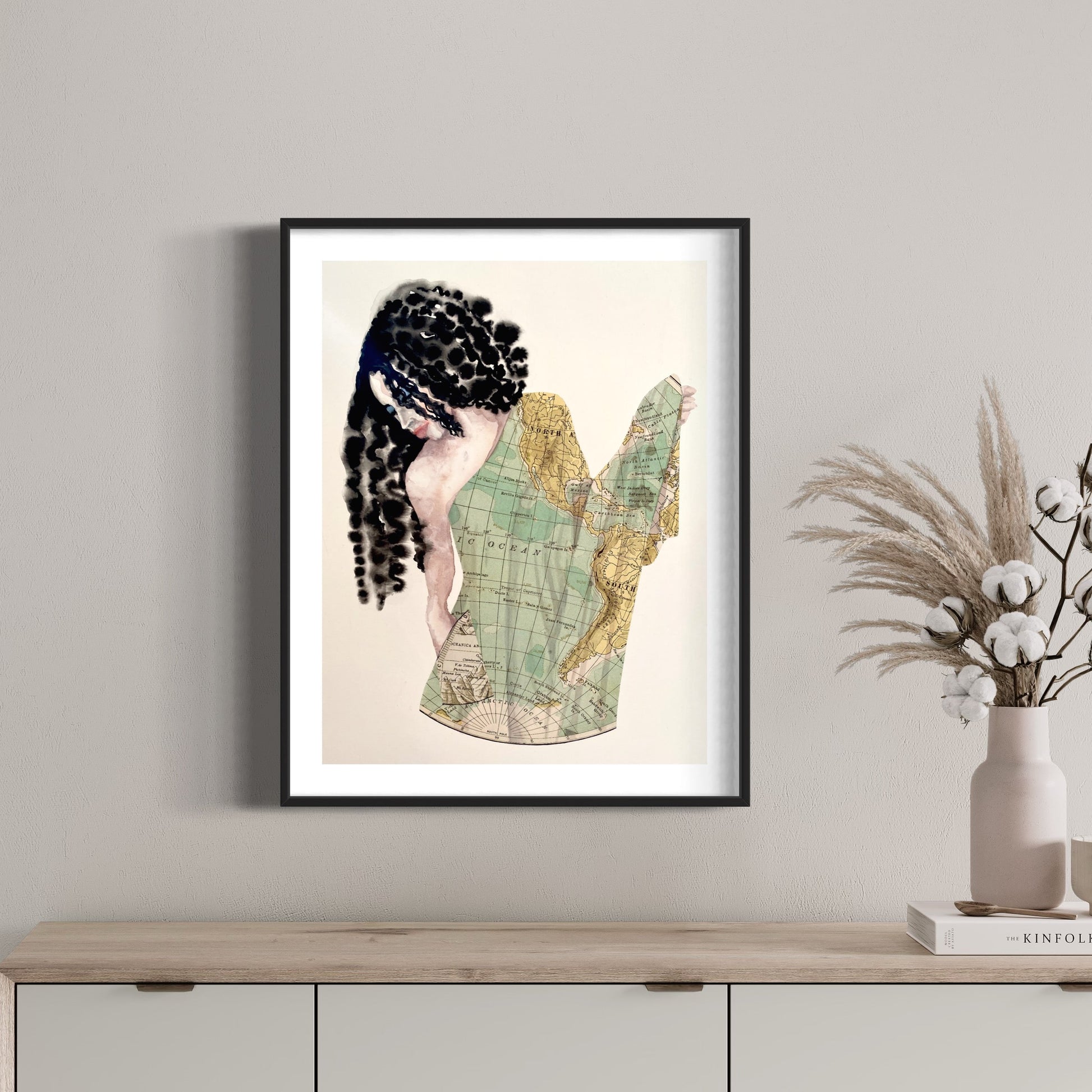 Description: A watercolour representing a 'Gaia-like' Goddess depicted in a globe dress, donned with collaged maps of the earth. Quite simply, Gaia is life. She is the very soul of the earth. She represents the interconnectedness of everything. Earth as a living, self-regulating entity which sustains all life.